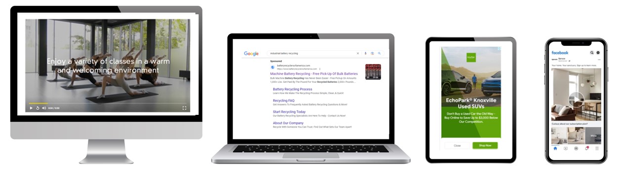 Digital advertising allows you to deliver the right message, in the right format and at the right time. Show search, display and video ads across a variety of devices including phones, tablets, computers and TVs to optimize the impact of your message.